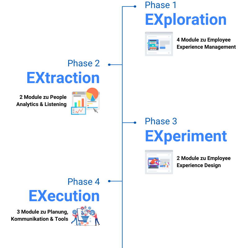 Das Programm ist in vier aufeinander aufbauende Phasen mit insgesamt 11 Modulen unterteilt zu den Kernbereichen Employee Experience Management & Design, sowie People Analytics und Tools. Enthalten sind sämtliches Know-how und alle Methoden für die erfolgreiche Implementierung und aktive Gestaltung bester Employee Experience.