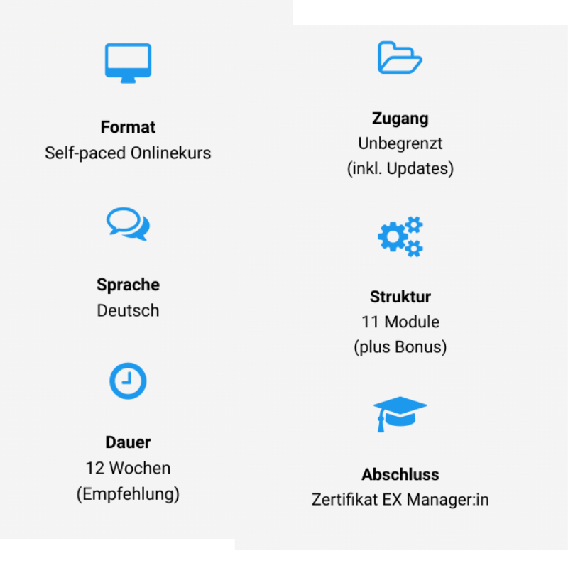 Die Employee Experience Academy liefert das komplette Playbook, mit Know-how, Methoden, Vorlagen, Leitfäden, Berechnungssheets, Fragenset, etc., damit du EX Management in allen Details verinnerlichst und deiner Organisation bei der Umsetzung optimal helfen kannst.